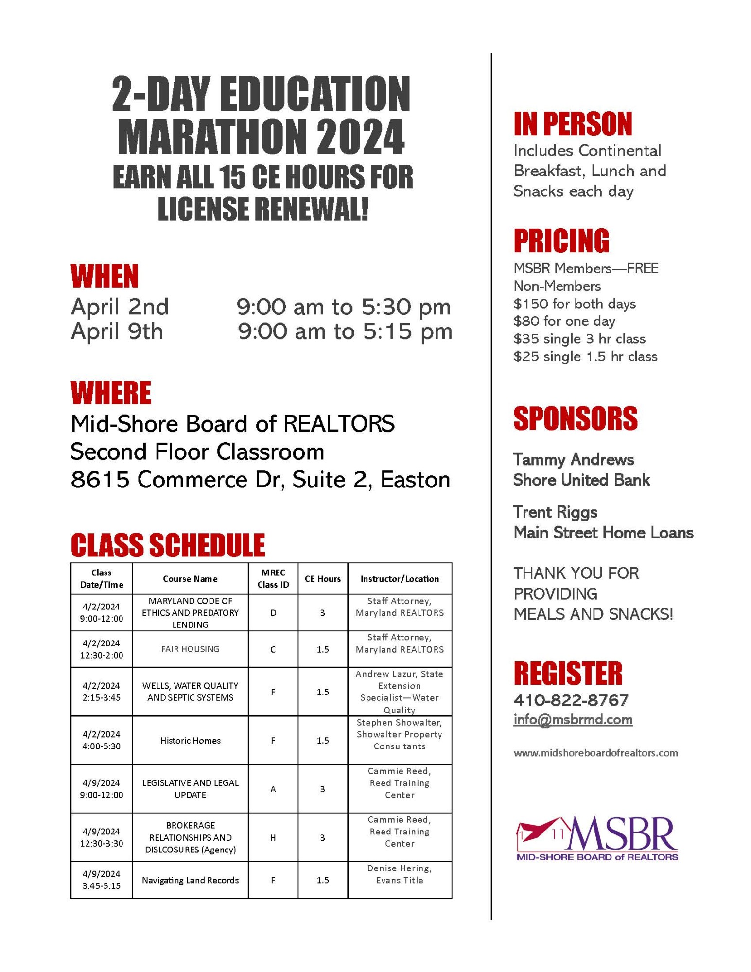 Sellers Representative Specialist Course (SRS)- MSBR will hold this 2-day class in person at the Board office on April 23 & April 24th. Early bird cost is $250 by April 10th, afterwards the cost is $295. 6 elective hours of CE credit.