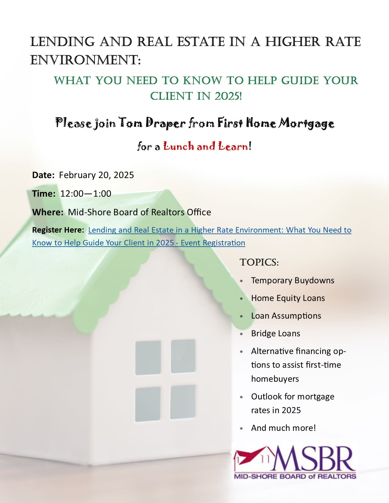 Join Tom Draper with First Home Mortgage for a Lunch and Learn. Topics covered will be: Temporary Buydowns, Home Equity Loans, Loan Assumptions, Bridge Loans, alternative financing options to help FTHB's, and an outlook for the year ahead for mortgage rates, & more!