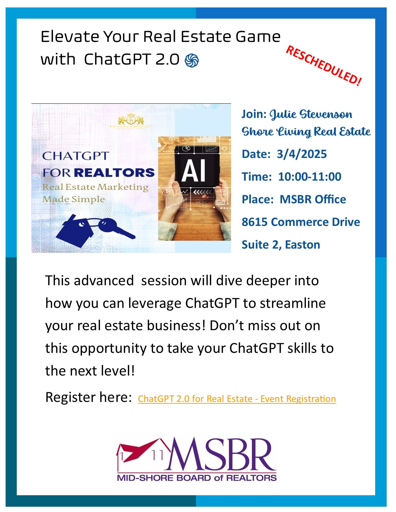 Julie Stevenson will introduce you to ChatGPT 2.0 so you can help grow your real estate business in ways you never thought possible. This updated version can now engage in more natural, human-like conversations by understanding hypothetical situations, slang, idioms, and figurative language, while also accessing real-time information through Google Search to provide accurate, up-to-date responses. Register Here