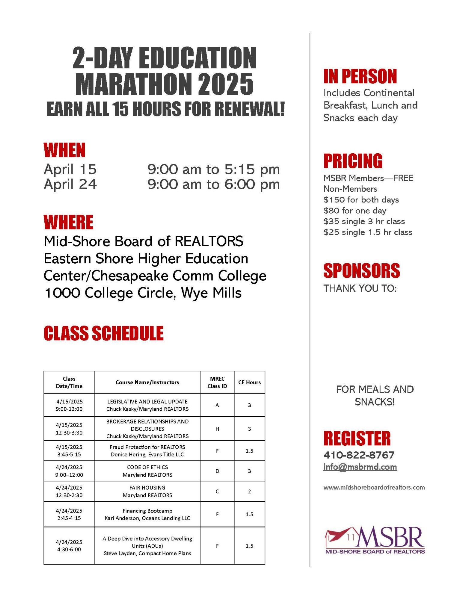 Contracts for the Newly Licensed April 10, 2025 9am-noon An in-depth review of the residential contract. Join instructor, Michelle Abplanalp, Rosendale Realty, for this in person class at the MSBR office.