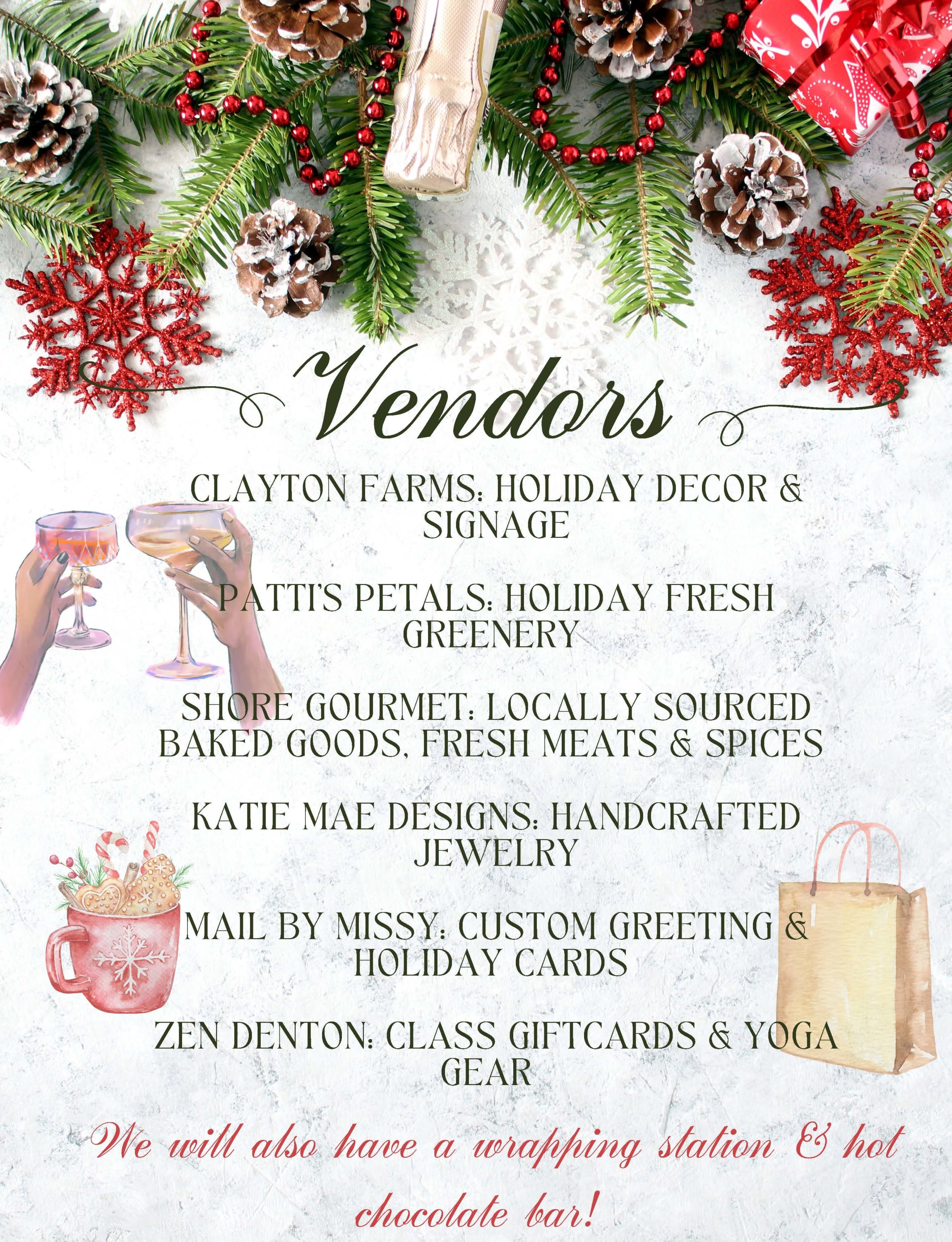 Join us for a Holiday Sip and Shop. Friday, December 1st from 5:30 to 7:30 at the Chesapeake Culinary Center, 512 Franklin St, Denton. There will be free drinks and appetizers; live music; shopping with local vendors; gift wrapping; and a hot chocolate bar! Bring a donation of toiletries for the His Hope Ministries Shelter.Images